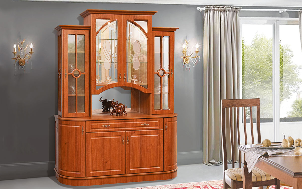 Витрина Цезарь "Світ Меблів" выполнена в классическом стиле. Верхняя часть витрины комплектуется стеклянными фасадами с красивыми витражами и стеклянными полками, за которыми монтируется зеркальная панель. Ваша любимая посуда будет смотреться в такой витрине просто великолепно. Нижняя часть: глухие фасады из МДФ, боковые тумбы радиусные, что придает витрине более завершенный вид. Под столешней находится большой выдвижной ящик для хранения столовых приборов. Корпус витрины выполнен из ДСП.